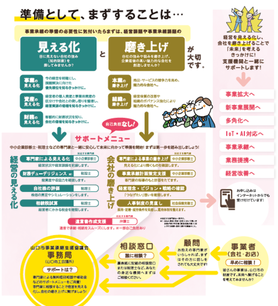 山口市事業承継支援協議会(事務局:山口商工会議所)は、市内中小企業の後継者不足の改善に向けて、経営状況・経営課題等の把握(見える化)と事業支援に向けた経営改善(磨き上げ)を中心に事業承継の支援をしています。